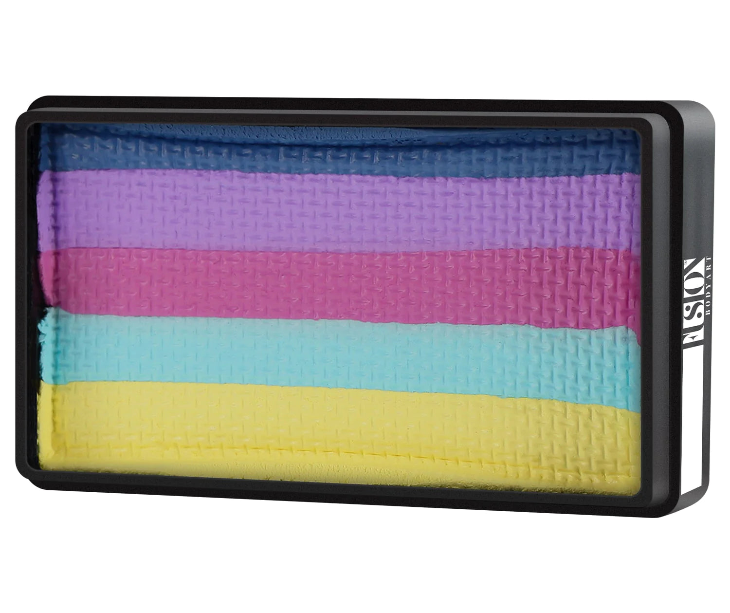 Fusion Body Art’s split cakes just require a flat face painting brush and water to get started. For flowing cheek art designs use a 1” flat brush to load all of the colours in the split cake or use smaller flat brushes to just pick up a few of the colours. Make sure to start with a slightly damp brush and add more water as needed by just dipping one corner of the brush lightly into your water. If you are new to 1 stroke face painting, the internet is filled with tons of amazing 1 stroke design ideas to inspire you. This method of face painting will save you a lot of time, and it will impress your clients as they watch these beautiful Fusion Body Art colours flow off your brush at the same time. You can also load your split cakes with small face painting sponges or round daubers. When using sponge, dab the colours onto the skin where you would like them, gently patting back and forth until all of the colours are even and bold.