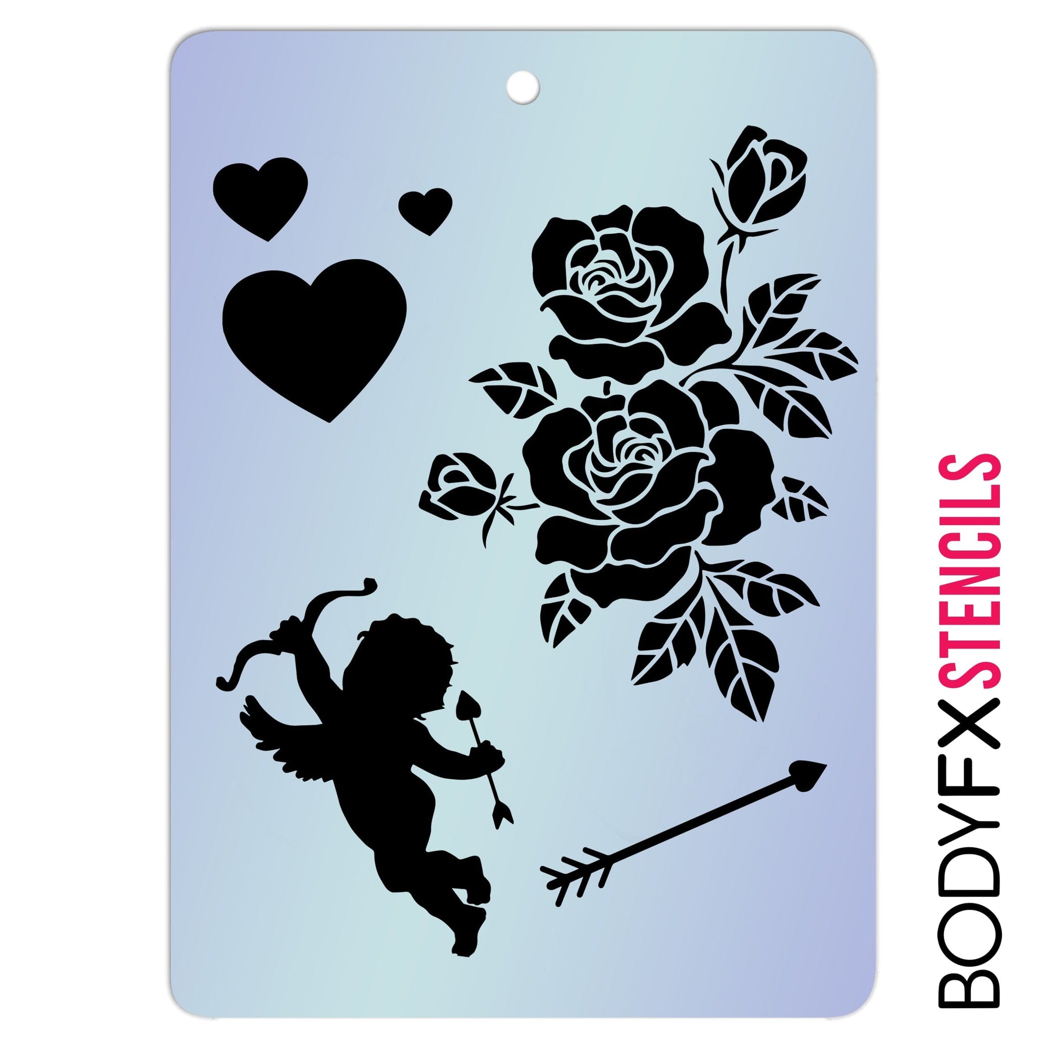 BodyFX Stencils are made of a durable yet flexible 7 mil mylar plastic. The material is medium-weight and about the thickness of card-stock. The material is thin and flexible enough to achieve outstanding detail when stenciling, yet strong and flexible enough to clean and use many, many times.